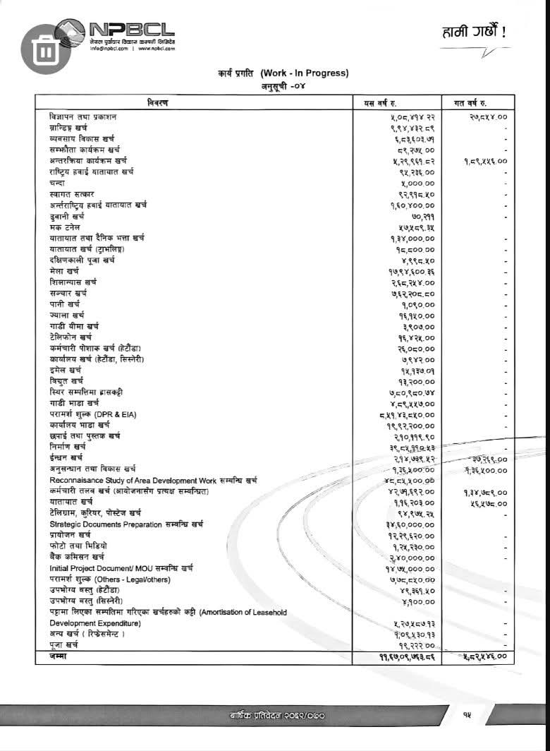 हेटौंडा / NPBCL को पछिल्लो सार्वजनिक गरिएको प्रतिवेदनले करोडौँ रुपैयाँ खर्च भएको विवरण सार्वजनिक गरेपछि यसको पारदर्शिता र प्रभावकारितामाथि गम्भीर प्रश्न उठ्न थालेका छन्। प्रतिवेदनअनुसार ११ करोड ७२ लाखभन्दा बढी रकम विभिन्न कार्यक्रममा खर्च गरिएको उल्लेख गरिएको छ, तर त्यसअनुसारको ठोस विकास कार्य भने देखिन नसकेको भन्दै स्थानीय जनता आक्रोशित बनेका छन्।