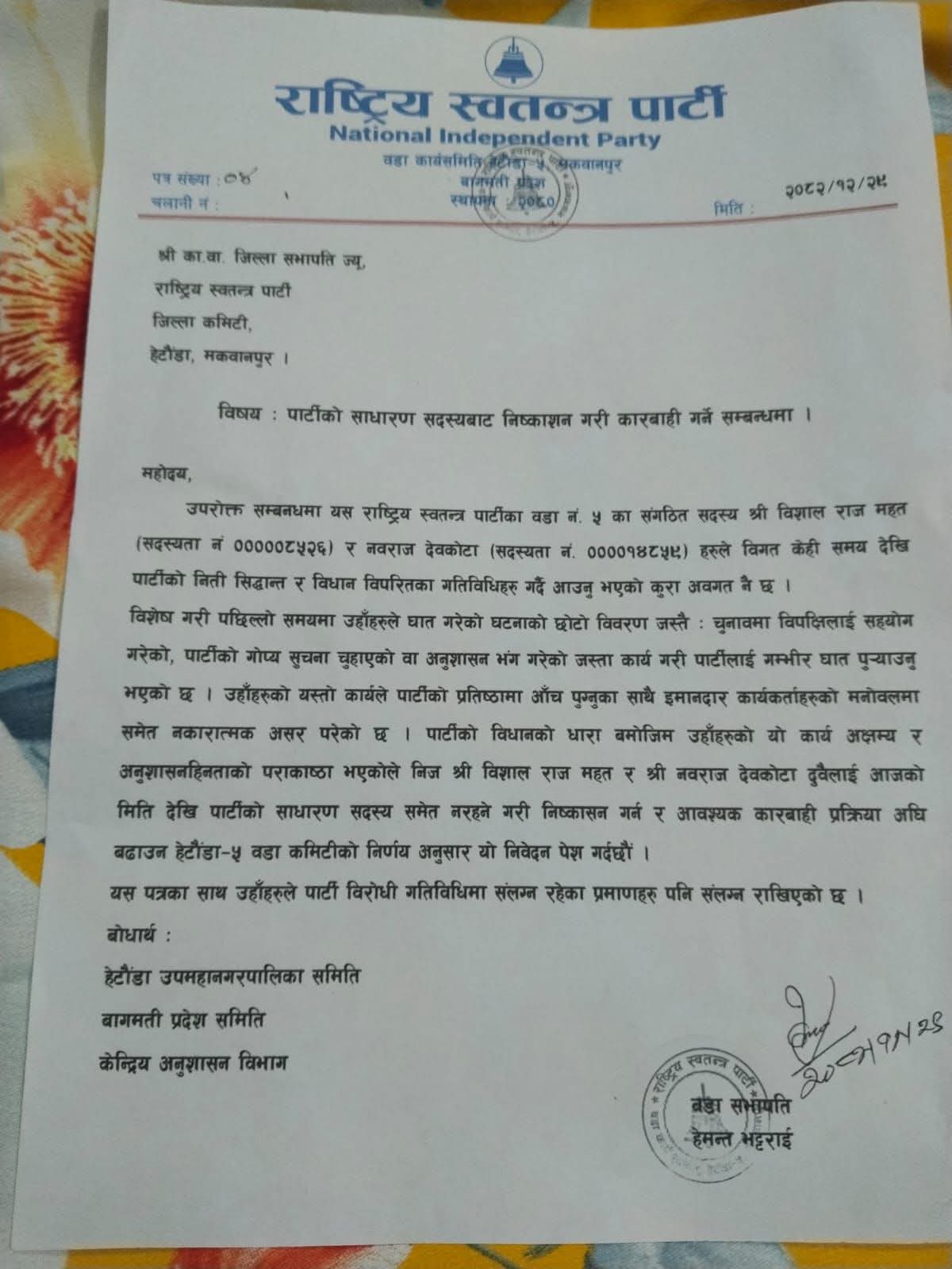 पार्टीले दिएको होइन यो भावना यो त म भित्रको बोध हो, जुन पार्टी जन्मिनु अघि पनि जिउँदो थियो, र आज पनि छ। भोलि पनि रहन्छ। तर जब कुनै पार्टी आफूलाई वैकल्पिक भन्दै,फरक मतलाई दुश्मन ठान्छ,सवाल गर्नेलाई निकाल्ने भाषा बोल्छ त्यो पार्टी वैकल्पिक रहन्न पुरानै सोचको नयाँ आवरण मात्र हुन्छ । ममाथि गरिएको व्यवहार केवल राजनीतिक निर्णय होइन, यो मेरो मानहानि हो, मेरो अस्तित्वमाथिको प्रहार हो।