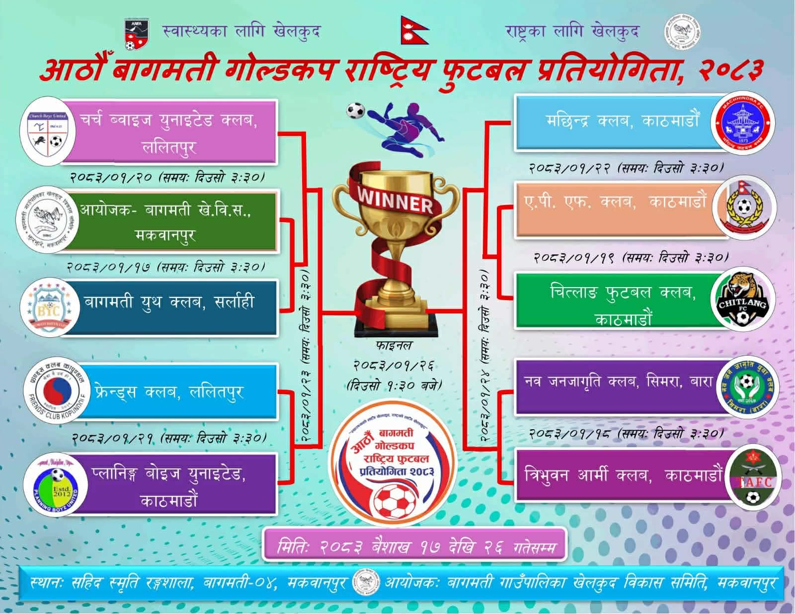 यस्तै, फ्रेन्ड्स क्लब र प्लानिङ ब्वाइज युनाइटेडबीच अर्को प्रतिस्पर्धा तय गरिएको छ भने मछिन्द्र क्लबले एपीएफ र चित्लाङबीचको विजेतासँग खेल्नेछ। प्रतियोगिताको सेमिफाइनल खेल बैशाख २३ र २४ गते हुनेछन् भने उपाधिका लागि निर्णायक भिडन्त बैशाख २६ गते हुनेछ।